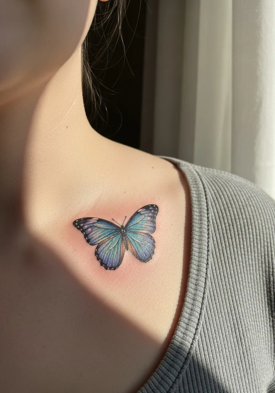 2. Blue Butterfly Collarbone Tattoo