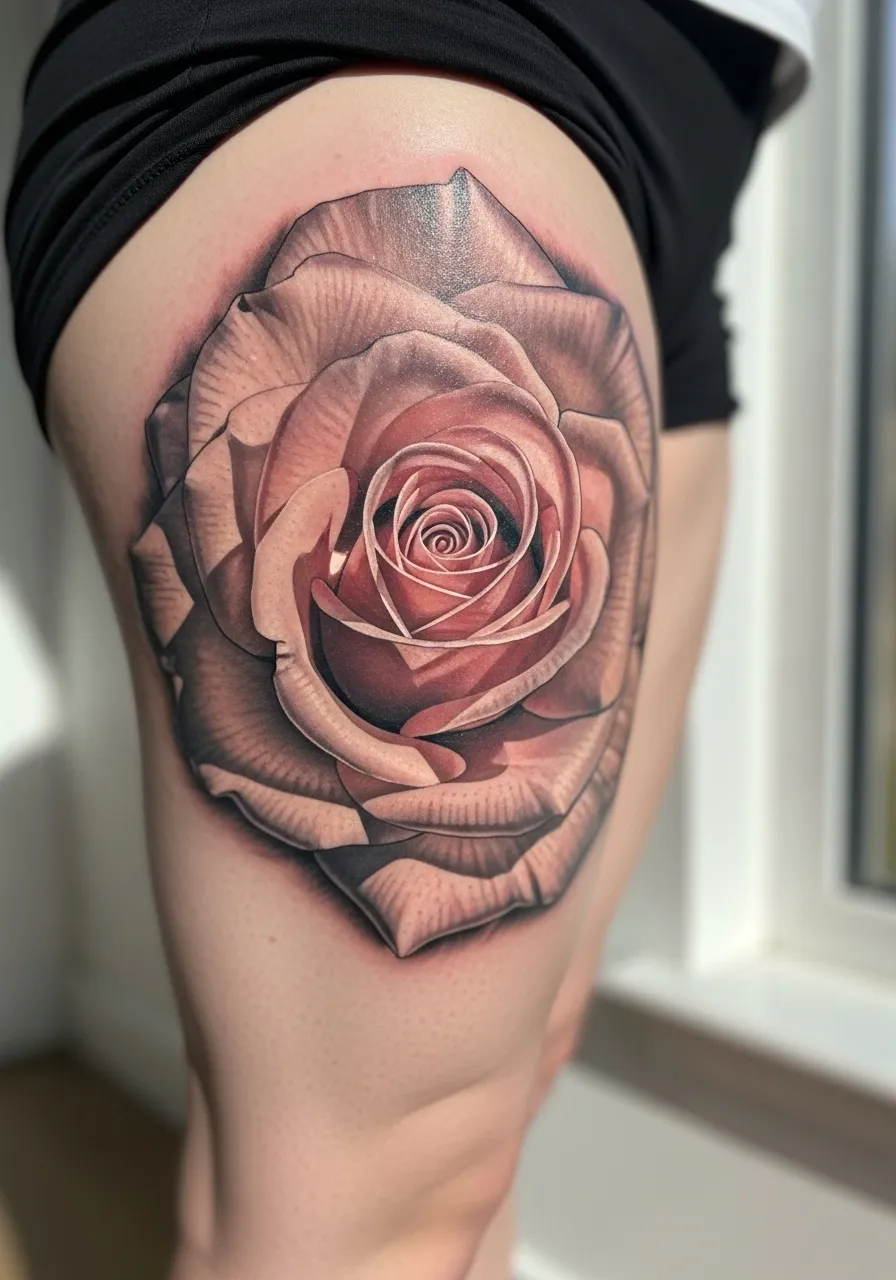 Roses are classic for a reason, but a realistic rose? Game changer. This design features layers of petals in soft pink and beige tones that look touchable. The shading creates depth that makes the flower seem three-dimensional, like it’s blooming right there on your thigh.