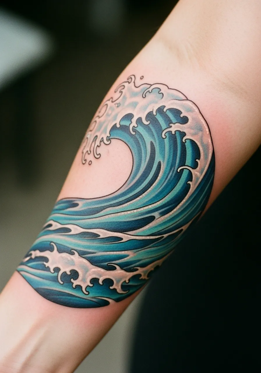There’s something mesmerizing about a wave frozen in time. This forearm tattoo captures that exact moment with blues, teals, and foamy white highlights blending seamlessly. The curves follow the arm’s natural shape, creating fluid, dynamic movement.