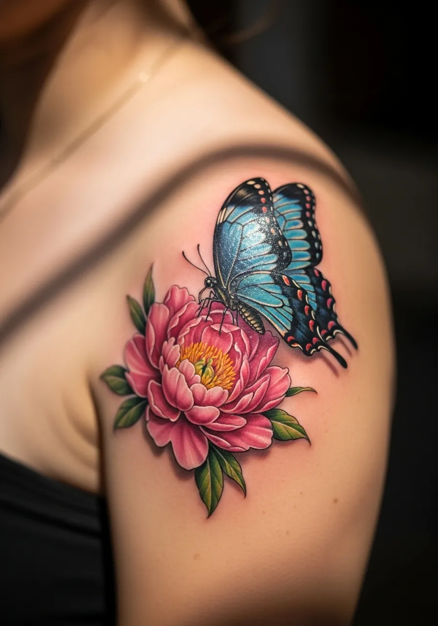 14. Butterfly and Peony Shoulder Tattoo
