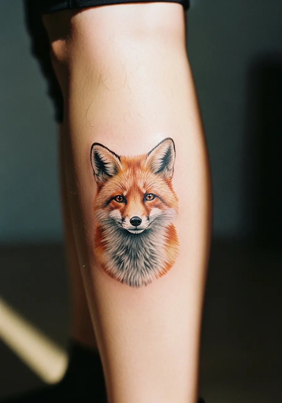 Foxes bring cleverness and grace to the table, and this calf design captures that perfectly. The orange and grey fur looks soft enough to touch, with subtle highlights bringing the eyes to life. Every strand has been carefully inked for incredible texture.