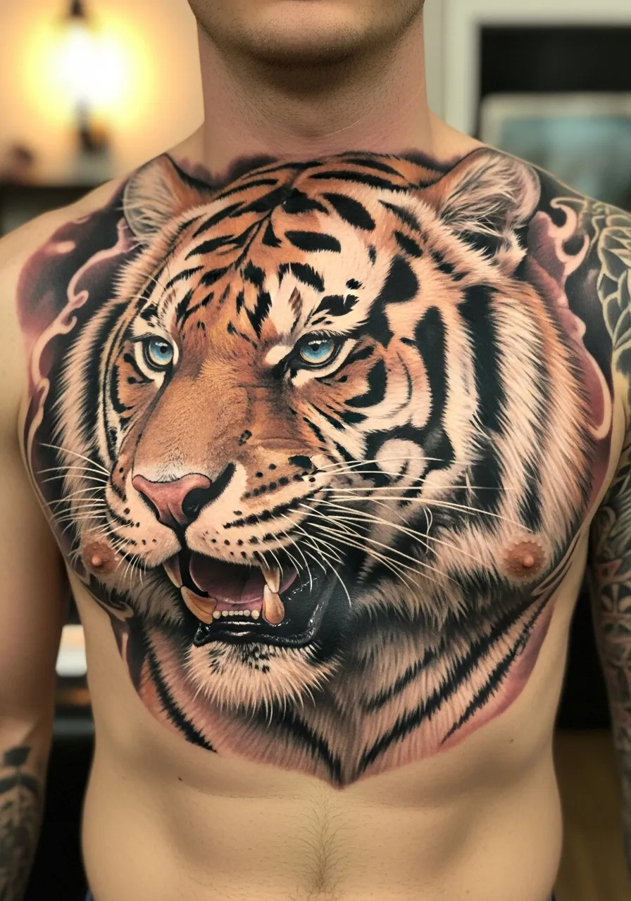 This chest piece commands attention. The tiger’s orange and black stripes are inked with perfect contrast, while those piercing blue eyes follow you everywhere. It’s fierce, it’s bold, and it radiates pure confidence.