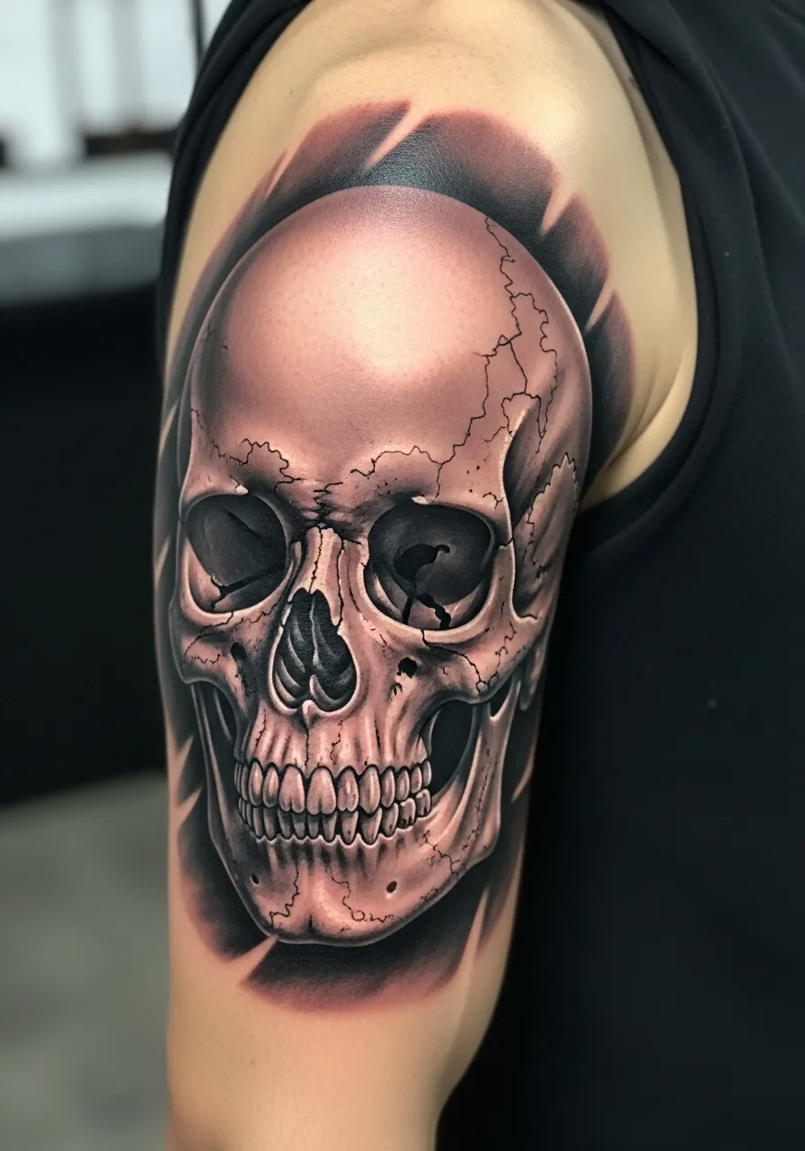 17. Bold Skull Shoulder Tattoo