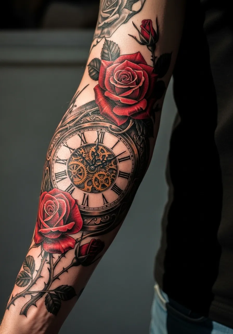 18. Clock and Roses Sleeve Tattoo