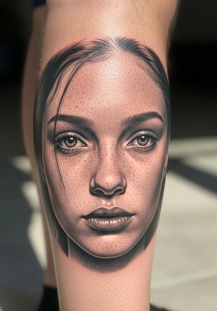 Portrait tattoos are the ultimate test of an artist’s skill. This leg design features a woman’s face so lifelike, you’ll do a double take. Every freckle, eyelash, and highlight is rendered with insane accuracy.