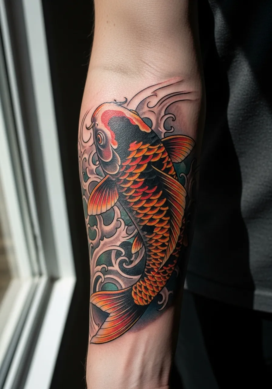 Koi fish symbolize perseverance and transformation, and this forearm piece brings those meanings to life. Rich oranges, golds, and blacks create shimmering scales with incredible dimension. Soft blue water waves swirl around the fish for constant motion.