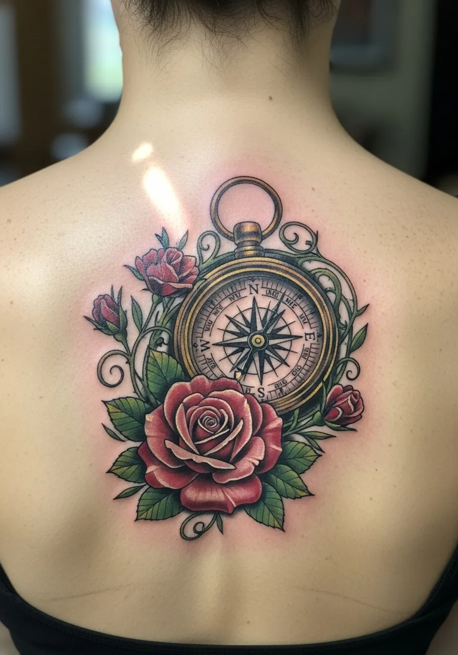 This back piece combines vintage compass work with blooming red roses for a design that’s both romantic and adventurous. The gold and bronze compass tones contrast beautifully with vivid red petals and lush green leaves.