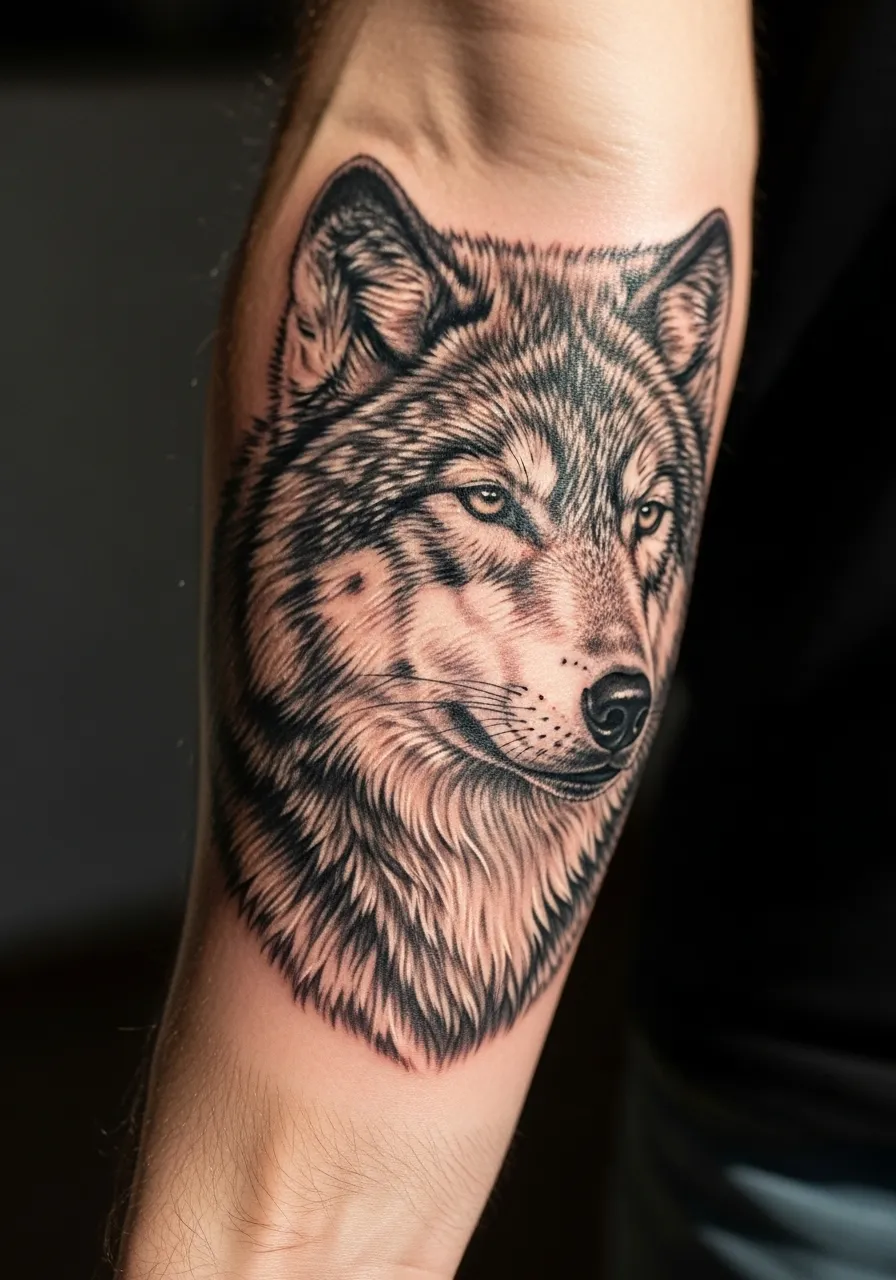 Wolves represent loyalty, strength, and wild freedom. This forearm design captures all of that with incredible black and grey realism. Every single strand of fur is meticulously inked, creating texture you can almost feel.