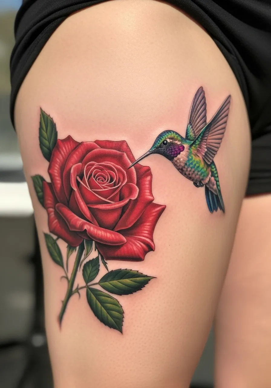 This thigh tattoo pairs a ruby red rose with a lively hummingbird caught mid-flight. The shading on the petals gives incredible depth, while the bird glimmers with iridescent greens, purples, and blues. The placement allows both elements to breathe perfectly.