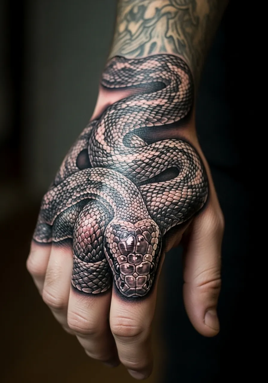 Bold placement alert! This hyper-realistic snake coils naturally around the knuckles and fingers, with scales so perfectly shaded they look ready to slither. The black and grey tones keep it striking without overwhelming.