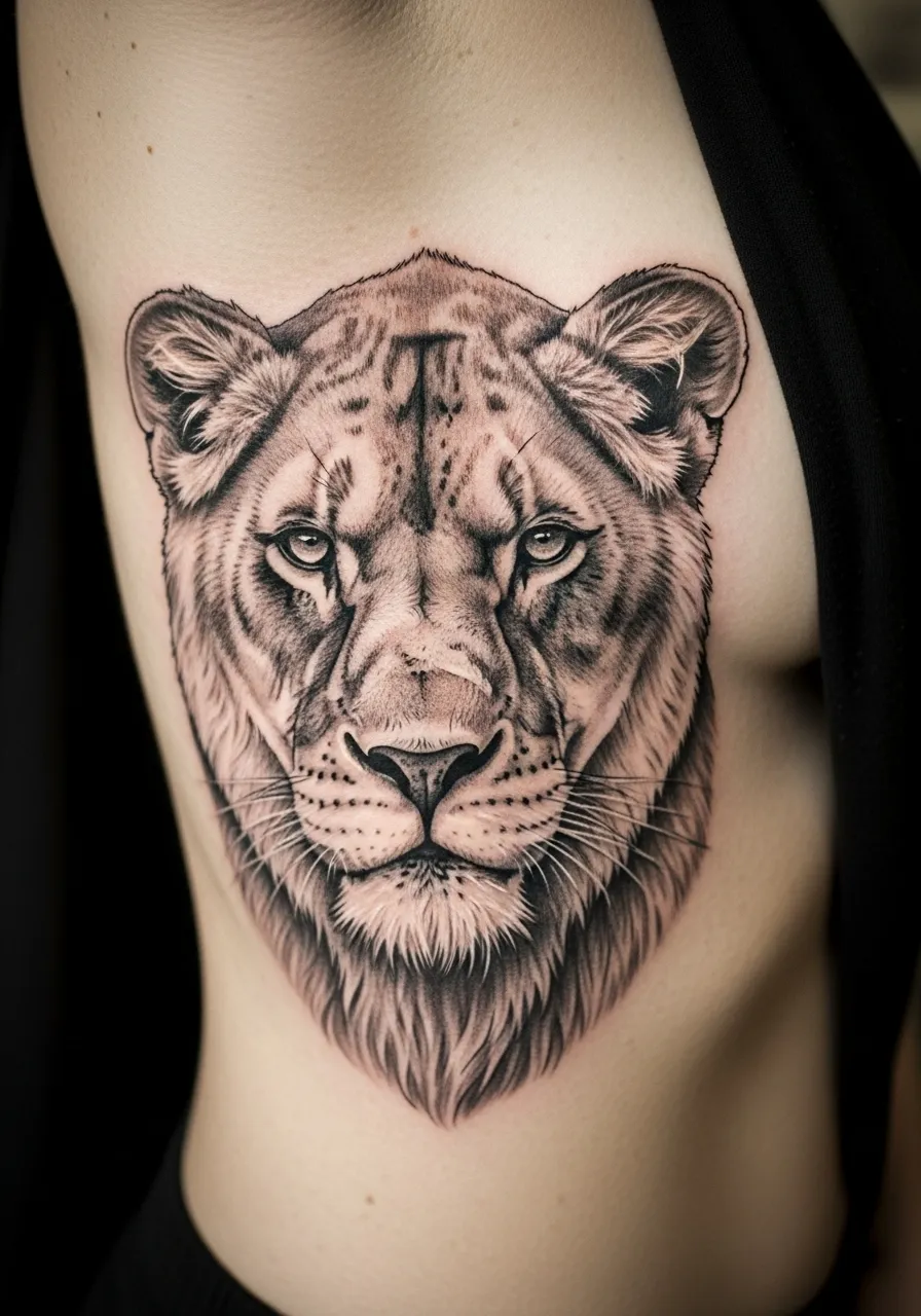 Rib tattoos hurt like hell, but when they look this good? Worth it. This lioness features fine black and grey shading that highlights both strength and elegance. Every strand of fur and facial contour has been crafted with incredible realism.