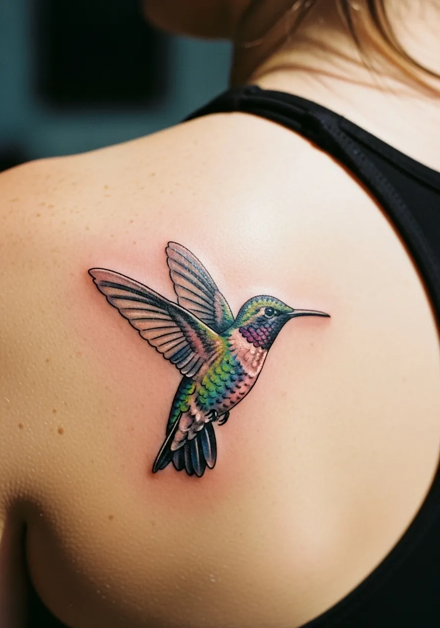 Hummingbirds represent joy, energy, and living in the moment. This shoulder placement gives it an airy, floating quality that matches the bird’s nature perfectly. The colors glow beautifully in natural light, making it one of those realism tattoo ideas that never gets old to look at.