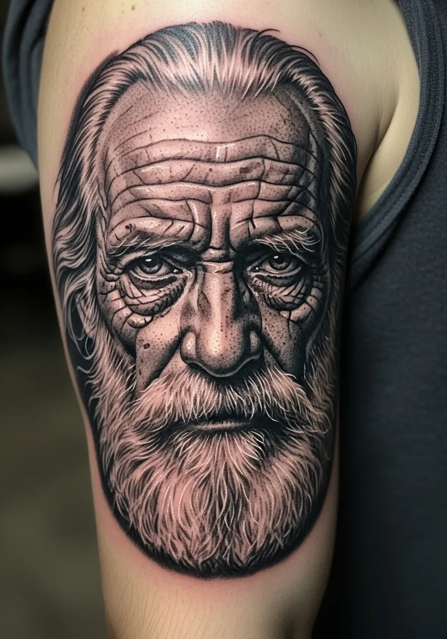 This arm tattoo captures pure soul. The portrait of an older man shows every wrinkle, pore, and strand of hair with stunning precision. The grayscale tones and soft transitions make it feel almost photographic.
